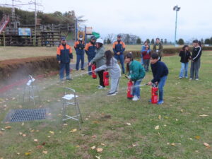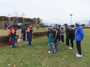 当日、利用していた小学生も参加して、登米市消防署北出張所熊谷所長さん以下署員の皆さんに親切丁寧にご指導をいただきました。